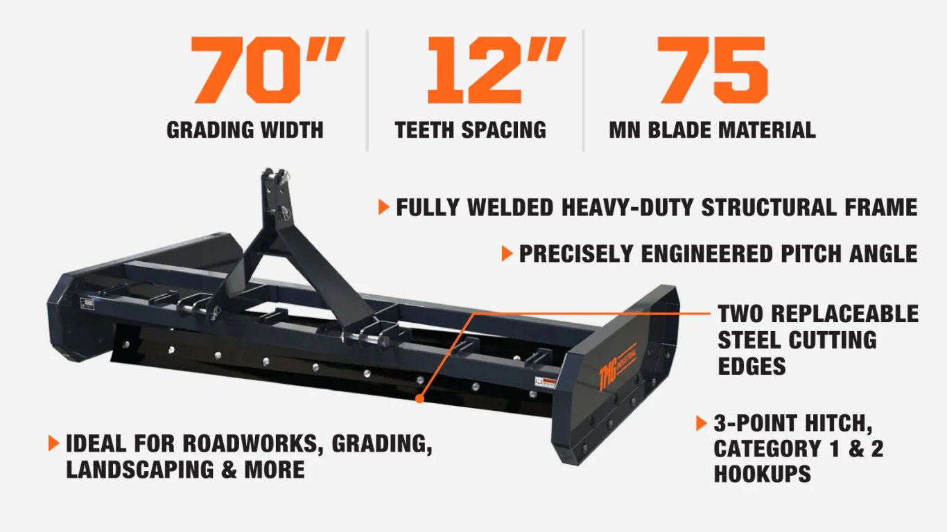 Equipped with a 3-point Category 1 and 2 hitch for easy hookup to your tractor, this is a great addition to any agricultural property owner for keeping roads and driveways smooth and operable. It also has an adjustable depth of 3” to 5” to help mitigate wash boarding and fill potholes in heavy traffic areas.