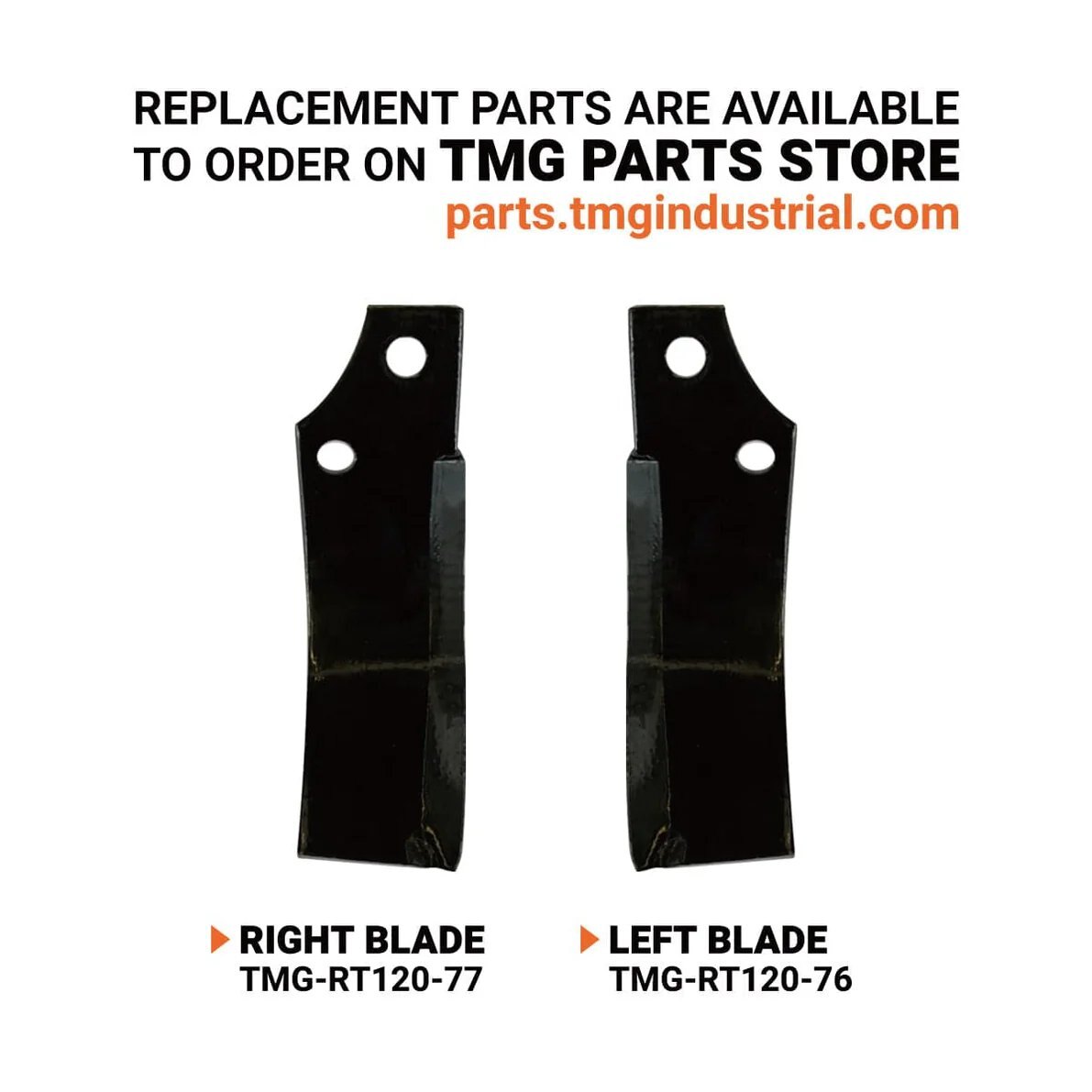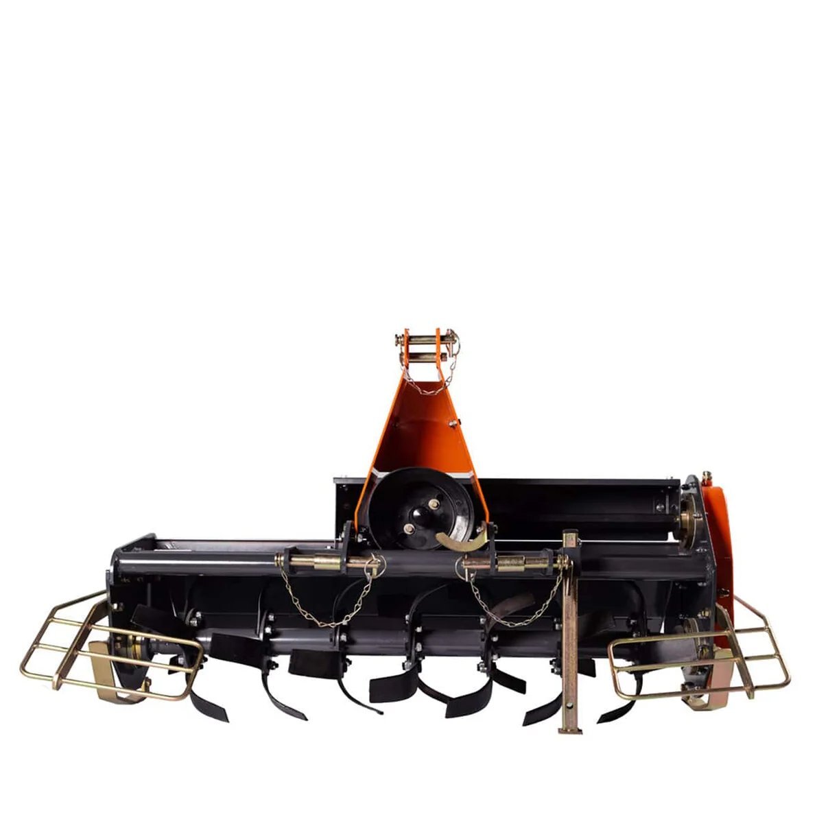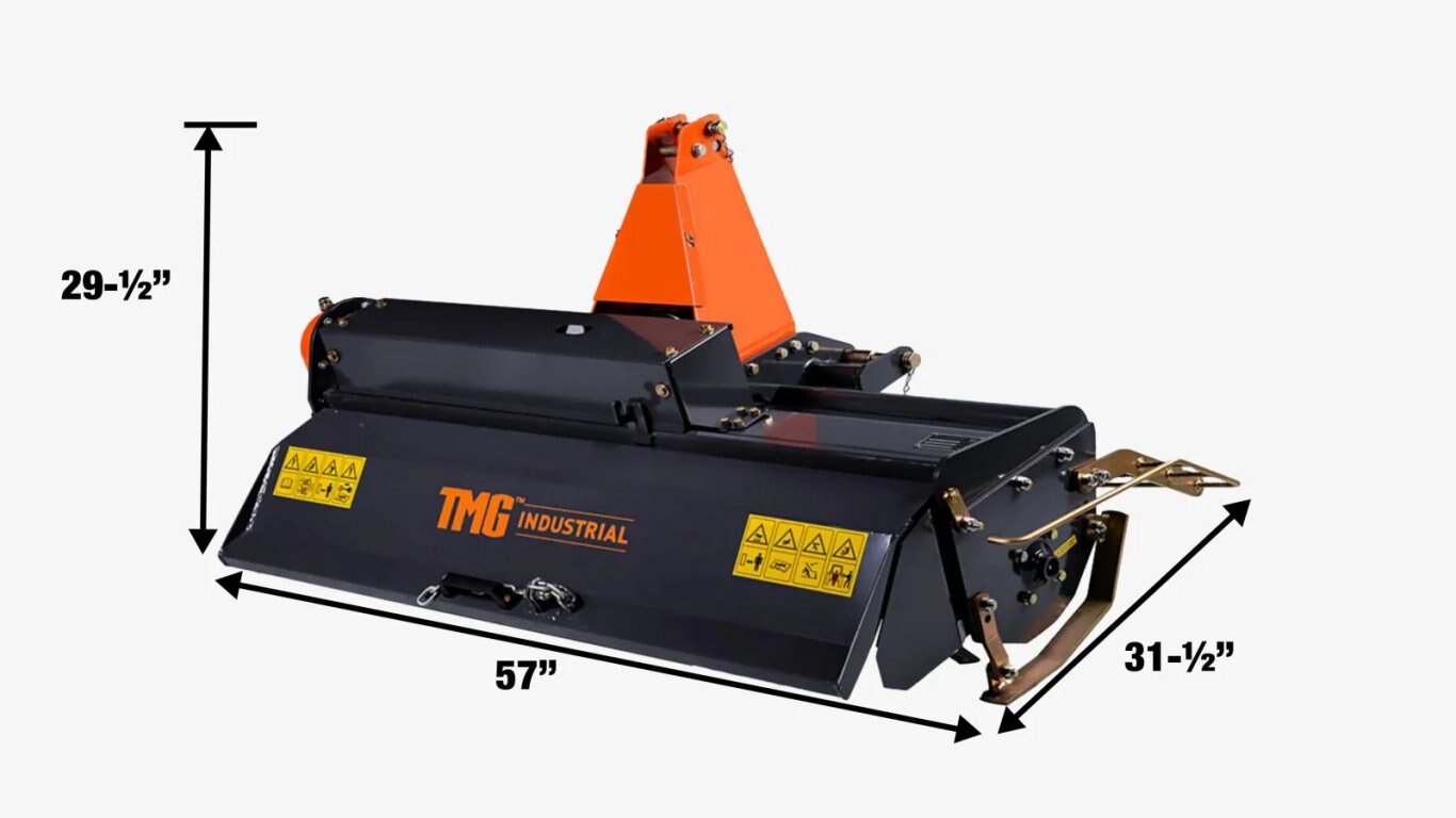 The TMG-RT120 3-Point Hitch Sub-Compact Rotary Tiller prepares your garden beds, nursery or hobby farm for seeding applications, landscaping and overall long-term land health and maintenance. Bring new life to your dirt by turning up old, tired grounds to reveal the fresh, nutrient rich soil available underneath. Comes with an included PTO shaft for Category 1 hookups and is compatible with most 18-30 HP sub-compact tractors. 28 replaceable heavy-duty tines powerfully dig into the ground at a low, forceful speed of 284 RPM. This ensures a thorough, efficient reworking of the land after just one pass and leaves a beautiful layer of organic material settled evenly on top. Critical process for proper aeration and eco-diversity amongst the different sediments and starts to improve growing potential immediately. Adjustable skid shoes allow you to control the tilling depth up to a maximum of 3-½”, and the 48” width makes quick work of larger plots. Minor assembly required and easy to access gear boxes for simple maintenance over time. Enclosed side drive chain protects your power transmission and a powder coated finish ensures a dependable, long-lasting piece of equipment for you and your property. |